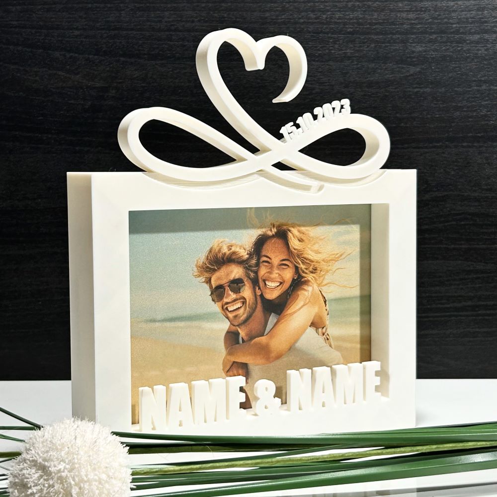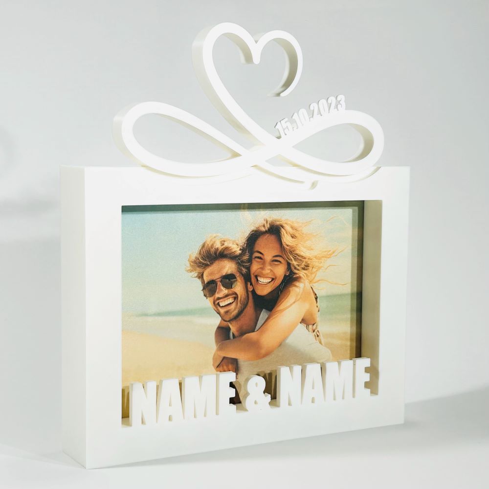 Dieser individuell gestaltete Bilderrahmen mit Herz und Unendlichzeichen ist das perfekte Geschenk für besondere Anlässe wie Jahrestage, Hochzeiten, Valentinstag oder Weihnachten.