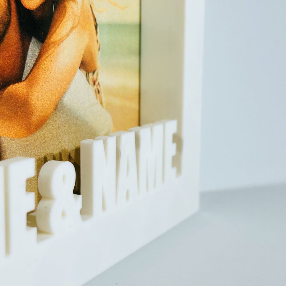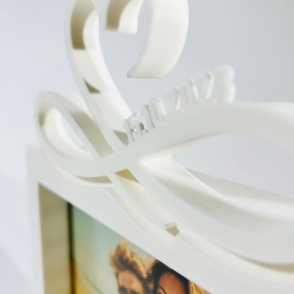 Verleihe dem Bilderrahmen eine persönliche Note durch zwei Namen und einem speziellen Datum auf dem Unendlichzeichen. Ideal für Paare, um besondere Momente festzuhalten.