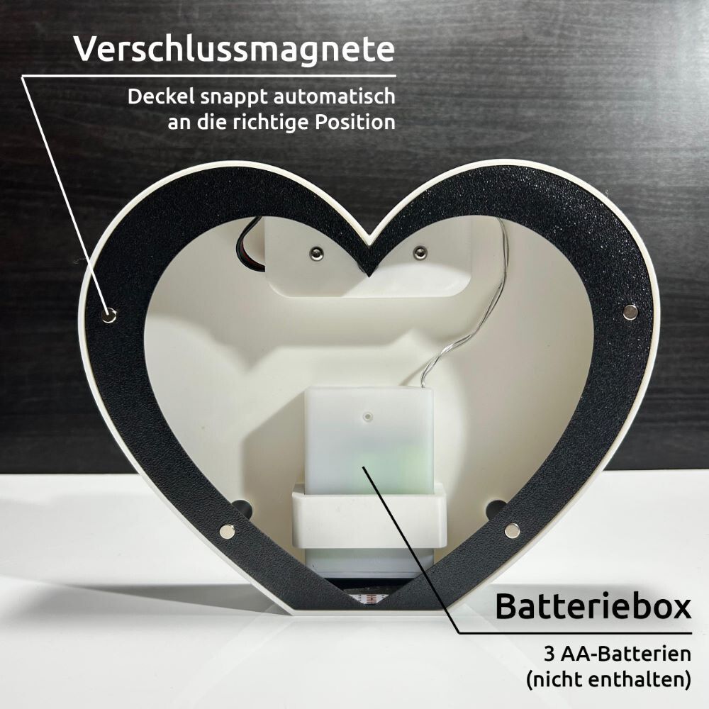 Die Herzoberfläche und das Gehäuse, das das Batteriefach enthält, werden durch starke Magneten zusammengehalten und lassen sich einfach öffnen und schließen.
